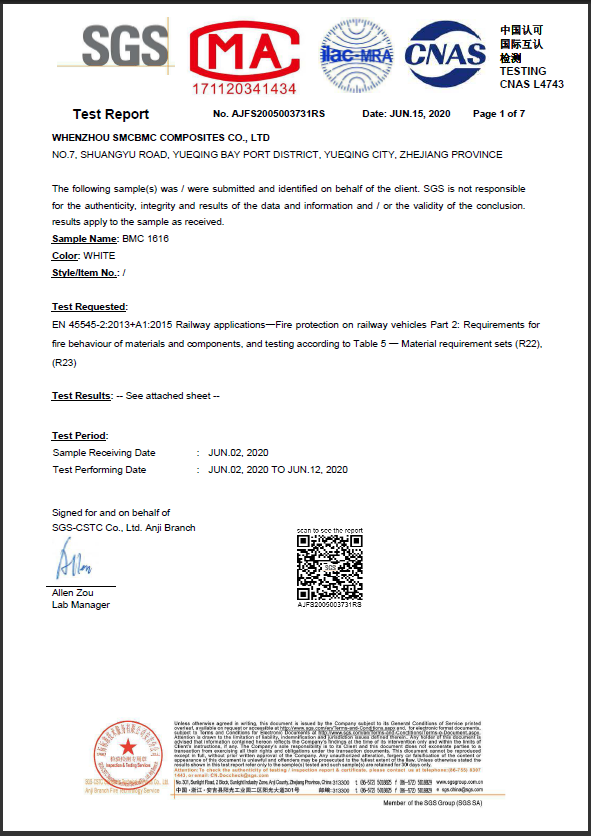 Item BMC 1616 passed EN45545-2 R22 & R23(Fire protection standard for rail transit vehicles) : HL3